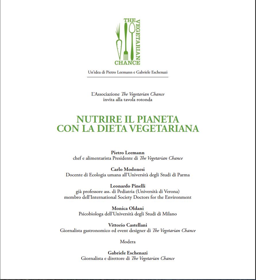 Il 3 marzo alle ore 18 a Milano a Palazzo Isimbardi (Corso Monforte, 35) The Vegetarian Chance serve sulla “tavola” di Expo un tema che al momento non sembra una priorità dell’esposizione universale: il vegetarianismo. A Expo si parlerà di sostenibilità, di fame nel mondo, di un rapporto più rispettoso col cibo, di lotta agli sprechi, di difesa dell’ambiente, di salute. Su tutti questi temi il vegetarianismo ha una risposta. Ne parliamo insieme a Pietro Leemann, Carlo Modonesi, Leonardo Pinelli, Monica Oldani, Vittorio Castellani. Siete tutti invitati a partecipare e a domandare. Ecco l’invito: