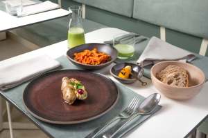 Da questi concetti hanno origine piatti sani, di qualità, a un prezzo ragionevole e proporzionato. Chiodi Latini rifiuta gli schemi dei classici ristoranti vegani dove nei piatti troneggiano i classici sostituti vegetali dei prodotti animali: seitan, tofu, tempeh, polpette di legumi. Nei suoi piatti le proteine sono dappertutto. Inutile domandarsi dove sono e cercarle perché non è rilevante così come non è rilevante la domanda che gli onnivori fanno ai vegani: «Da dove prendi le proteine?”. Ciò che è rilevante è invece il gusto. il sapore, la combinazione inusuale di materie prime che danno origine appunto al “new food”. Come dice sempre Pietro Leemann la cucina vegetariana è difficile, bisogna studiarla e impararla. Così ha fatto Chiodi Latini che anche per motivi personali si è prima dedicato alla teoria studiando sui testi del nutrizionista Colin Campbell e del filosofo Rudolf Steiner, e poi si è dato alla pratica decidendo di “partire dalla materia prima nella sua forma integrale evitando tutti i prodotti raffinati” per costruire ricette, che strizzano l’occhio alla cucina orientale dalla quale l’alimentazione a base vegetale ha importato moltissimo (tofu, tempeh, seitan, spezie, cottura delle verdure). La sua carta serale cambia ogni mese e propone menu degustazione da 35, 45 e 55 euro. Attualmente i piatti in carta sono: La rossa francese, Non chiamatelo uovo, Aglio fermentato e saraceno, Tre legumi, Khorasan e tartufo nero, Pak Choi, Apnea. Si alternano nomi criptici ad altri molto semplici. Ma non bisogna lasciarsi ingannare dai nomi dato che ciò che conta sono le preparazioni, che rendono una semplice verdura o un cereale qualcosa di molto diverso da quello che ci aspetteremmo. Ciò che noi siamo abituati a chiamare contorno in un comune ristorante italiano qui è un piatto a sé stante con una combinazione originale di gusti e consistenze che è prova della versatilità dei vegetali ai più sconosciuta. Il suo piatto più amato, La rossa francese è composto da tortelli di rapa cotta in acqua acidulata farciti con purea di patate e conditi con un’emulsione a freddo di olio di canapa e tamari.