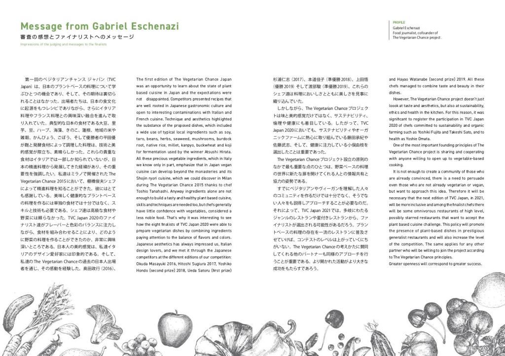 Il concorso TVC Japan che si è svolto il 2 settembre scorso a Tokyo è diventato un libro, che vi invitiamo a sfogliare qui online in alcune pagine scelte. Dell’evento abbiamo ampiamente parlato in questo sito. In un anno così difficile durante il quale abbiamo dovuto rinunciare al nostro Festival in Italia è stato particolarmente importante avere in Giappone qualcuno che con passione ha raccolto il nostro testimone. Il libro rispecchia la tradizionale eleganza e sobrietà giapponese e valorizza il lavoro e la missione dei cuochi, che hanno partecipato al concorso. Il 2021 al momento ancora non ci consente di programmare nulla, ma The Vegetarian Chance e il suo progetto intende estendersi in Italia e in Europa. Mai come oggi il vegetarianismo e la cucina a base vegetale in genere stanno guadagnando i favori dell’opinione pubblica soprattutto tra i giovani, giustamente preoccupati per il loro futuro su questo pianeta.