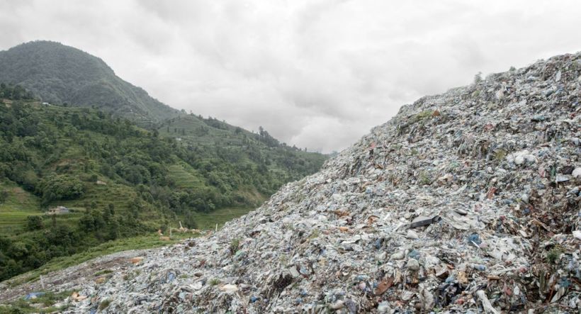 Una collina verde e una di rifiuti nel Sud est Asiatico