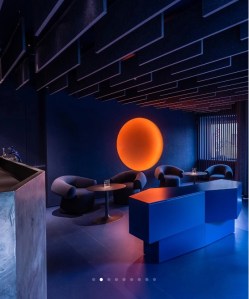 Si tratta di uno schema ricorrente nelle portate di questo ristorante ed è un antidoto prezioso alla «noia da piatto». Consistenze e intensità diverse stimolano il palato. E se mentre si mangia si punta lo sguardo al soffitto si potrà notare come il designer facendo filtrare la luce dall’alto si sia ispirato a un intricato bosco mentre la sala è illuminata di giorno da un’ampia vetrata.