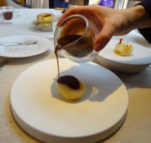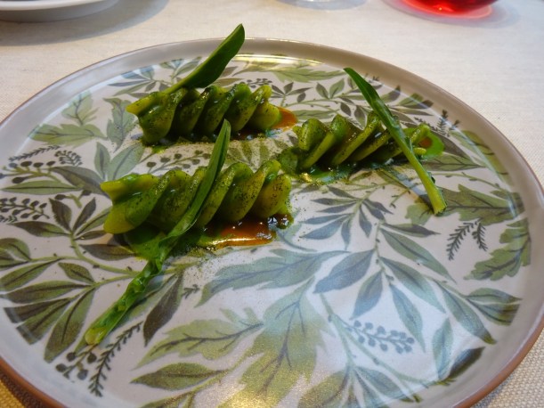 Si capisce che la sua sfida con in vegetali è vinta quando arriva in tavola un sedano rapa laccato come un anatra e accompagnato da un fondo di ortaggi, un brodo di sedano e un fermentato con maionese allo zafferano. Il prodotto della terra è stato usato nella sua interezza e senza sprechi consentendo, tra l’altro, allo chef di proporre in tavola un piatto composto in realtà di tre piatti associati.