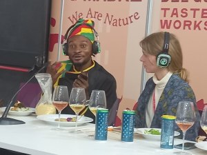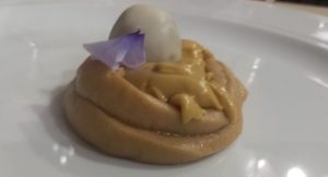 La zucchina matita arriva sul piatto come fosse stata trasferita direttamente dal campo al piatto, ma in realtà è stata cucinata….Il fiore contiene un ripieno a base di toma di capra vecchia ed è accompagnata da foglie di lattuga sucrine leggermente cotte e salsa medievale. Esercizio di cucina contemporanea è l’anteprima vegana che apre il pranzo: galletta di tapioca con lamponi e barbietola, gemma di peperone, che esplode in bocca, spugna d’erbe selvatiche.