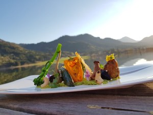 Aiuola di verdurine con fiocchi di quinoa, caviale di alghe, olio di lino. Un piatto vegano del Weissenseerhof Hotel