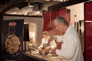 Pietro Leemann spiega al pubblico come si cucina la “pasta” di legumi Barilla