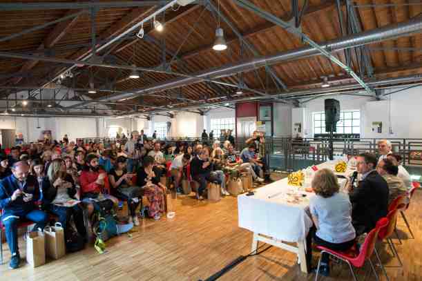 Cinque edizioni del Festival The Vegetarian Chance e mai la stessa sede, mai gli stessi ospiti, mai un programma simile all’altro, ma sempre lo stesso messaggio: la cucina a base vegetale fa bene al palato, alla salute, al pianeta, allo spirito e anche al portafoglio. Quest’anno ci siamo concentrati sul cambiamento climatico con il tema Mangia la foglia, salva il pianeta”. Questo filo conduttore si è potuto ritrovare nei diversi appuntamenti del Festival. Significativo e concreto è stato il primo quando sono saliti sul palco gli agricoltori, sempre più presenti in diversi mercati. Ne abbiamo scelti tre del Mercato della Terra Slow Food e abbiamo chiesto loro di raccontarci le loro difficoltà, il loro impegno per metterci a disposizione cibo biologico e sano, saporito e interessante. Intervistati da Gabriele Eschenazi sono saliti sul palco Giancarlo Colombo, El Giardinet, Marisa del Corno di Pioppo Tremulo, Aina Pacifico di Cascina Dulcamara. Hanno spiegato al pubblico come il cambiamento climatico produca danni alle colture in diversi modi e cioè non distrugga solo fisicamente le piante, ma provochi anche la proliferazione di malattie e parassiti fino a poco tempo fa sconosciuti nelle nostre zone. Aina Pacifico ha esemplificato con delle immagini i danni da raffiche di vento violente ai suoi alberi di noci. Marisa del Corno ha spiegato il valore della biodiversità raccontando come sia utile piantare sempre in contemporanea varietà diverse di fragole o pomodori, che hanno reazioni diverse rispetto a malattie e parassiti. Giancarlo Colombo ha spiegato come sia importante che siano gli stessi consumatori a difendere la biodiversità nutrendosi di un’ampia varietà di prodotti. Al suo banco posizionato all’ingresso si poteva mangiare la foglia nel vero senso della parola con una varietà incredibile di erbe selvatiche, fiori e insalate. Piante fresche appena colte dal campo, il modo migliore per assorbire la loro energia vitale. Non sempre questo è possibile e allora ci viene in aiuto la conservazione, quella antica con il sole, l’essicazione, e quella moderna con la catena del freddo, la surgelazione proposta dal nostro partner Orogel, nel cui spazio si è svolto uno show cooking dello chef Pietro Leemann con il piatto Anima Mundi, un tortino di patate e lenticchie, con salsa magrebina e crema di avocado siciliano. Il mondo ha un’anima, noi facciamo parte di quest’anima e quindi siamo un tutt’uno in questa relazione, la spiegazione del titolo nelle parole dello chef. Ad accompagnarlo per raccontare le virtù delle verdure anche surgelate quando quelle fresche non sono disponibili c’era la nutrizionista Elisa Brighenti.