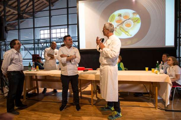 Antonio Cuomo, vincitore della quinta edizione del concorso The Vegetarian Chance con Pietro Leemann, che descrive il suo piatto
