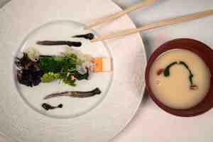 Il secondo piatto di Yoshiko è un chirashi sushi. Una nota culturale: la grande cucina giapponese, che è denominata Kaiseki-ryori, deriva dalla shojin-ryori, che è la cucina dei templi giapponesi la quale era per essenza sempre vegetale. La chef Hondo interpreta quella cucina. Nei templi dopo l’abate la persona più elevata in giappone era il cuoco, perché la cucina era estremamente importante per far sì che i monaci potessero pregare nel modo giusto. La cucina mediterranea è diventata patrimonio dell’umanità per i suoi valori nutrizionali e la seconda cucina che nel mondo è diventata patrimonio dell’umanità è proprio quella del paese del Sol Levante. In questo chirashi sushi troviamo un’alga che è stata arrostita a bassa temperatura, un riso cotto con del fiordaliso che una volta ricoperto di limone passa dal colore blu al colore viola e uno strepitoso tofu vellutato con sopra miso e mandorle. Infine abbiamo delle sfere trasparenti che sembrano quasi delle uova mistiche, un assieme di consistenza ma dove il gusto era assente: qualcosa da un pianeta totalmente diverso.